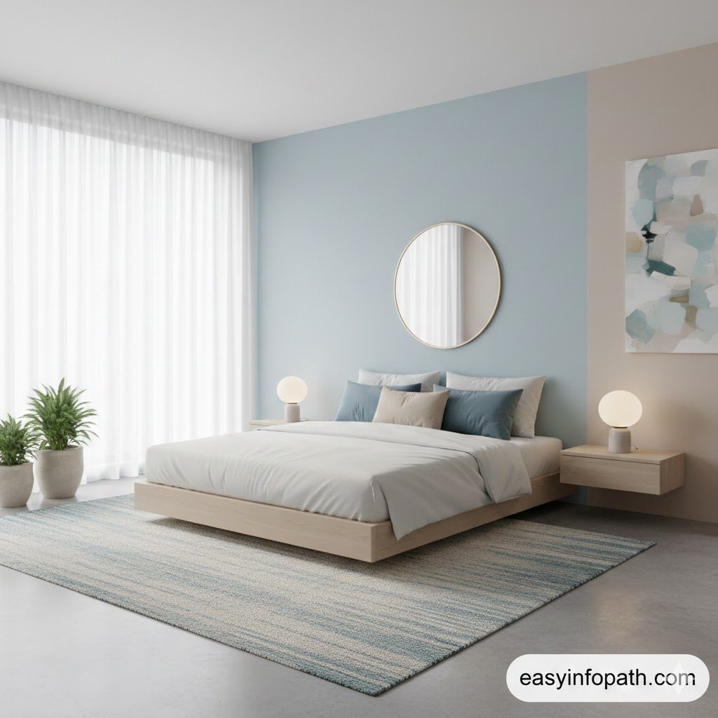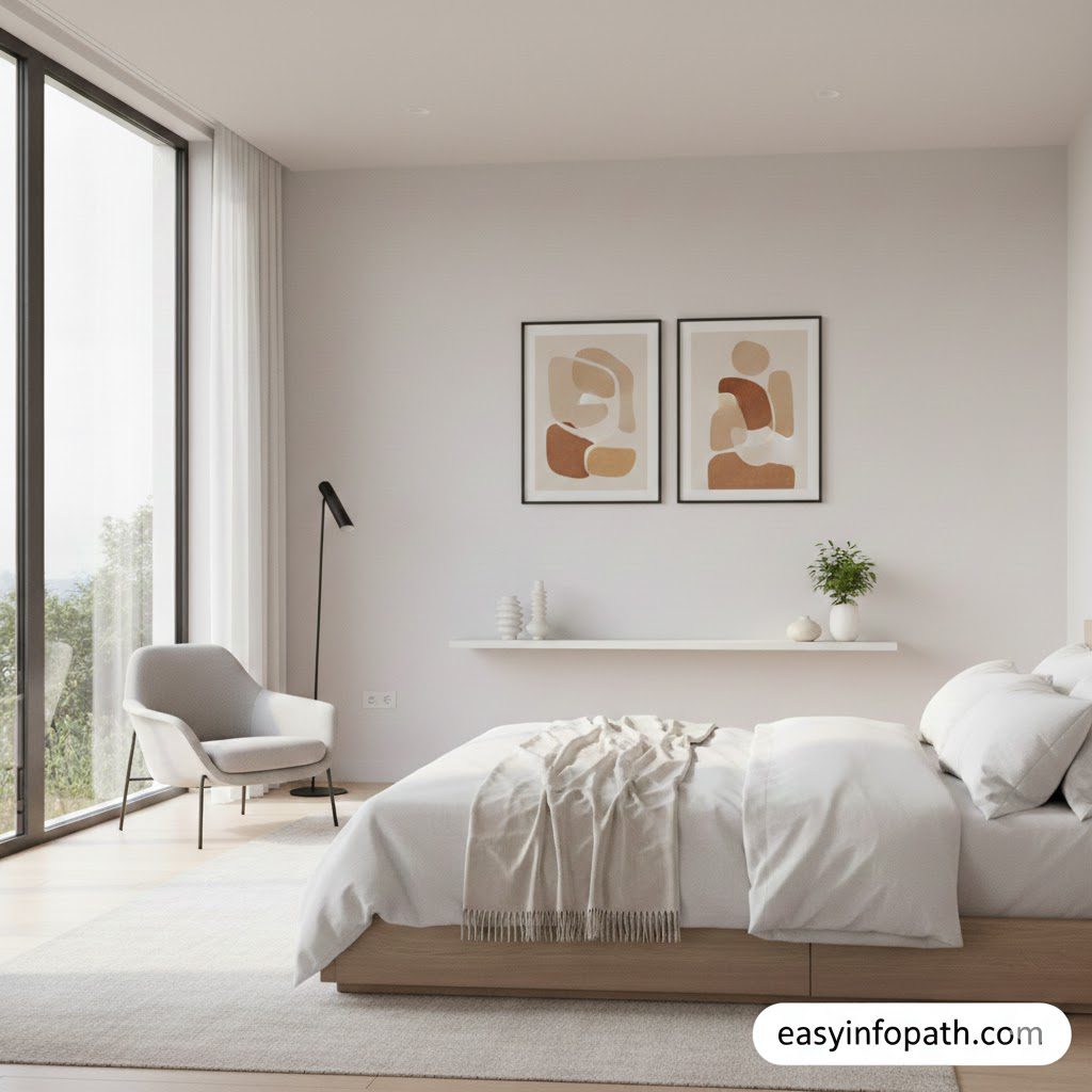 Soft colours like light grey, beige, pastel blue, and warm white are best for a calm bedroom. These shades help the room feel peaceful, brighter, and more comfortable for rest and sleep.