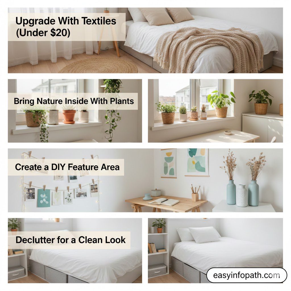 The best ideas include fairy lights, peel-and-stick wall art, new cushion covers, a small rug, indoor plants, and simple DIY décor made from items you already have.